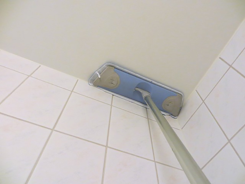 Избавиться от пятен и пыли на потолке без труда можно, если заполнить ведро водой и уксусом в соотношении один к одному. С помощью обычной швабры вымой этим раствором потолок ванной комнаты.Совет: чтобы уберечь свои глаза от попадания капель раствора с уксусом — надень перед уборкой очки.